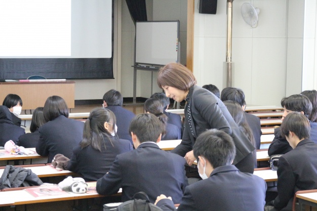 最初はやや緊張した雰囲気でしたが、いざ講義が始まるとメモを取るなどしてしっかりと話を聞いてくれました。出張授業を進める中で、皆さんの持つエネルギーや素直さが伝わり、とても楽しく指導することができました。