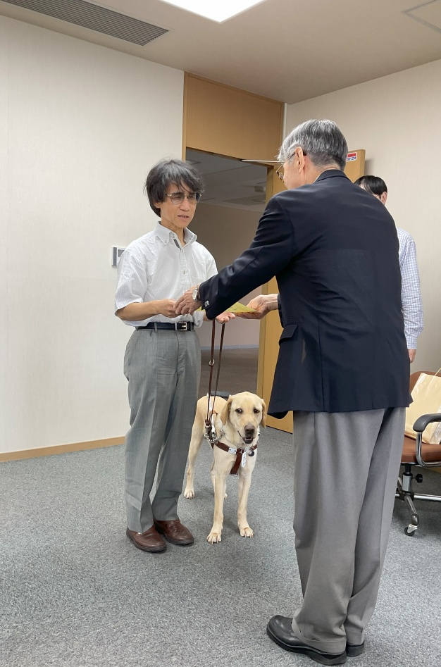 星野先生は福祉や介護の科目を担当してSAIJO歴25年! 星野先生の体験を踏まえた授業は、四半世紀にわたって学生からの人気を集めています。表彰式には、四代目盲導犬のラックくんの姿もありました。