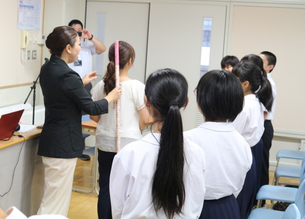 本学オリジナル教材の「SAIJO棒」を使用して、美しいお辞儀の練習をしました。