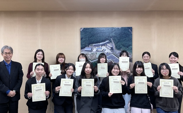 学生たちには桾沢学長より表彰状と副賞が贈られました。今回も多くの学生が受賞することができました。教職員一同、引き続きの成長を心から応援しています!