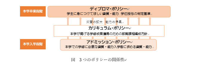 さらに、カリキュラム・ポリシーに基づく教育課程を修める学生を適切に受け入れるためにアドミッション・ポリシーを定め、ディプロマ・ポリシーの達成を見据えて本学での学修に必要となる基礎的能力や資質、適性を有する入学者像を示しています。
