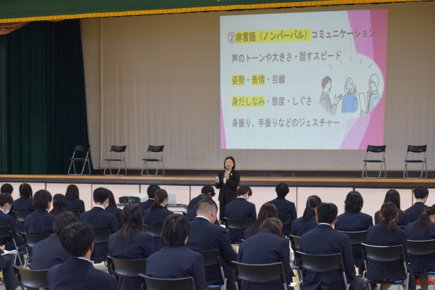 170名ほどの2年生を対象に、面接の心構えや身だしなみの重要性についてお伝えしたのち、立ち居振る舞いの実践練習を行いました。