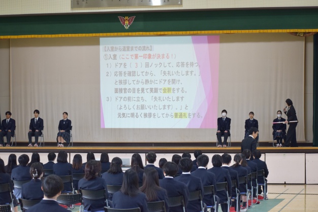 最後には、6名の代表生徒さんが壇上にて面接時の入退出の流れを実践してくれました。緊張しながらも堂々とした姿は、大変頼もしく見えました。