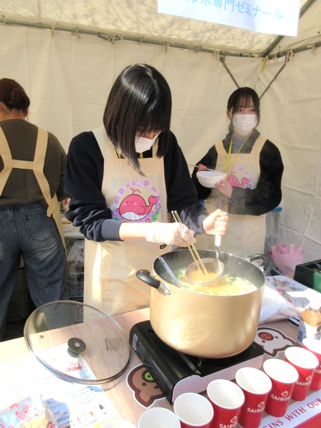 埼玉西部地域を盛り上げたい!と活動を続けてきた三ツ木専門ゼミの芋パーク出店も、今年で3回目。今回は干芋をフィーチャーした「SAIJO☆(ほし)いも豚汁」を考案し、専門ゼミメンバーとボランティアメンバー一丸となって美味しい豚汁提供に勤しみました。